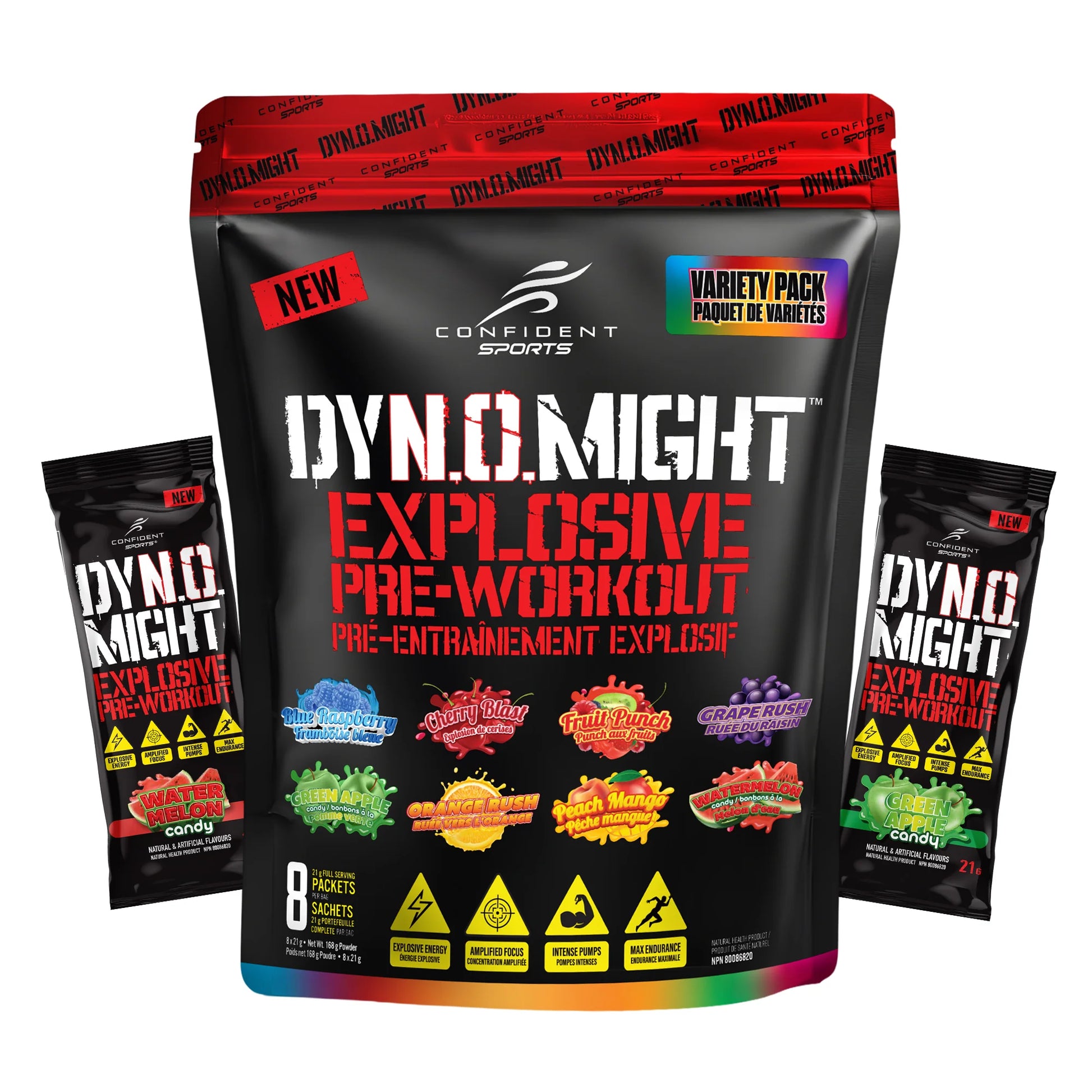 Unleash your athletic potential with the Dynamite Pre-workout 8-Flavour Variety Pack: Blue Raspberry, Cherry Blast, Fruit Punch, Grape Rush, Green Apple, Orange Rush, Peach Mango, and Watermelon Candy.
